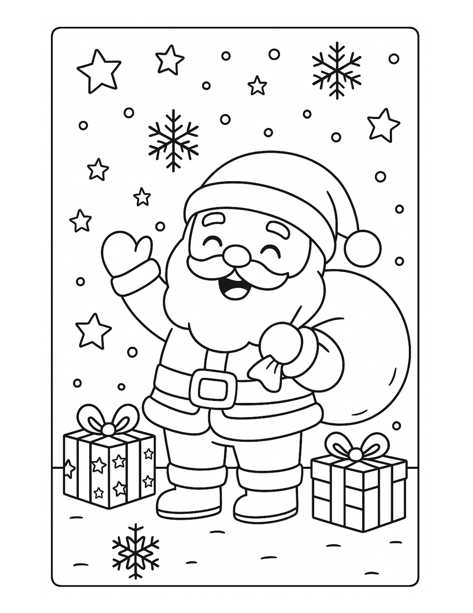 Ce cahier propose 25 coloriages tout mignons autour de l’univers de Noël : Père Noël souriant, rennes rigolos, bonhommes de pain d’épices, sapins décorés, cadeaux colorés et scènes festives pleines de douceur.